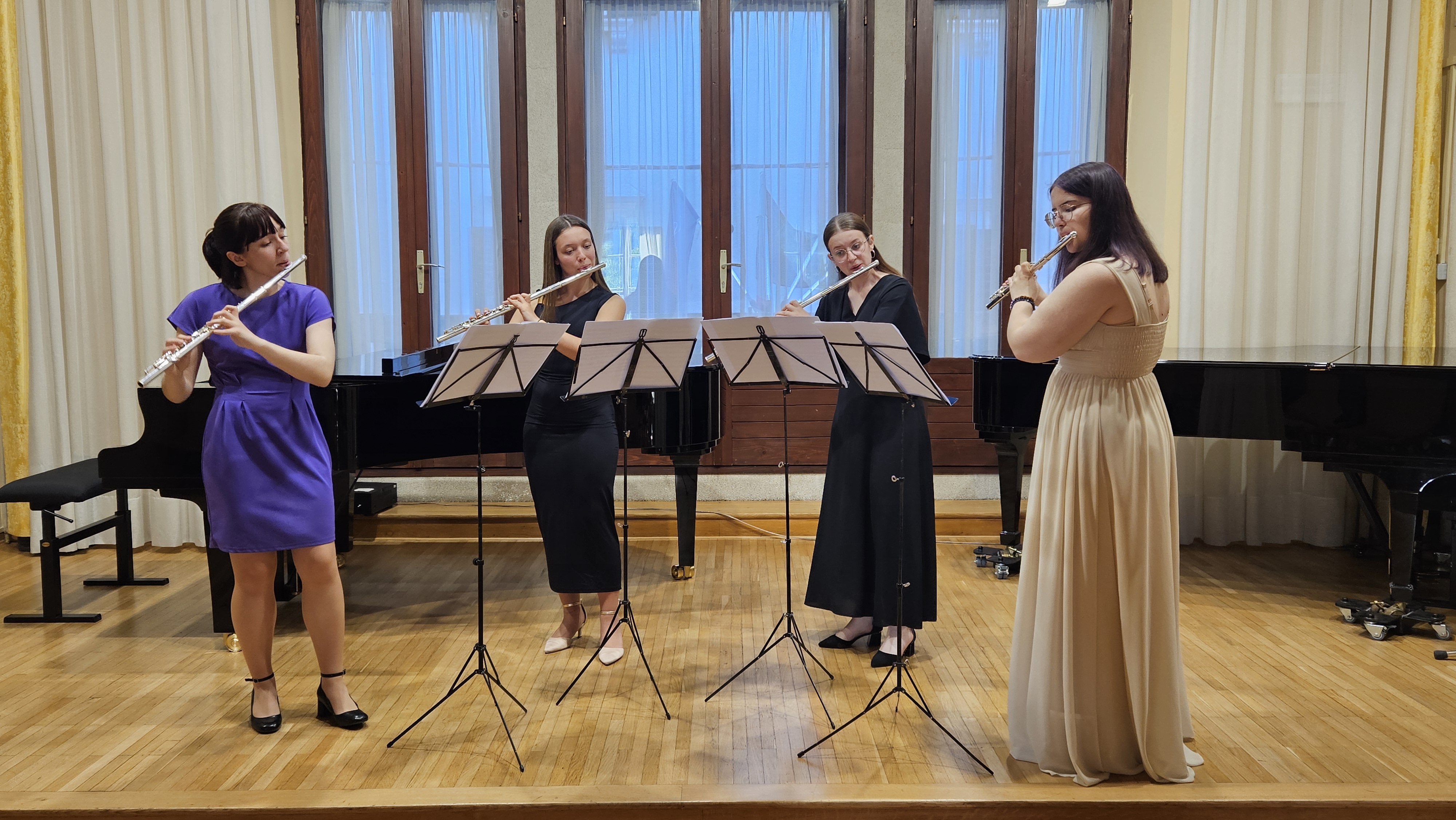 Skupaj smo preživeli sproščujoč dan z intenzivnimi vajami, izdelovanjem skladb za kvartet flavt, druženjem in večernim skupnim nastopom, kjer so se vse dijakinje predstavile tako solo kot v kvartetu flavt.
